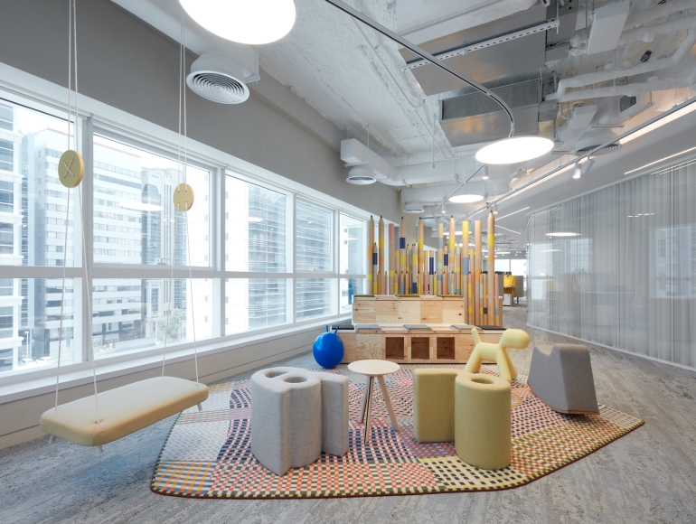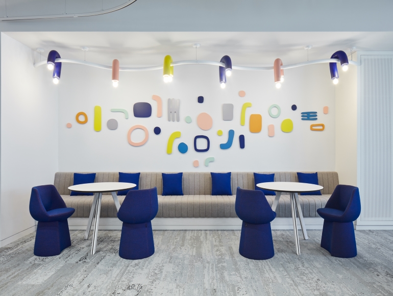 The ECA fit-out project is an amalgamation of a hybrid workspace and child-centric educational play area, which means that every space is unique and appropriated to its user. The entrance lobby welcomes guests with a life-size friendly monster ‘Big Blue’ and an array of playful, vibrant and tactile joinery features, which sets the tone for the rest of the space. Flowing walkways connect a variety of bespoke hubs such as workstations, naturally lit meeting rooms, a children’s playroom and purpose-built maternity room.